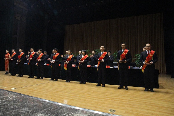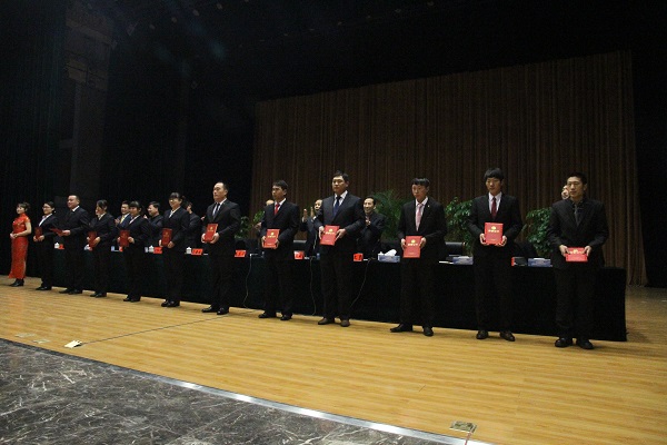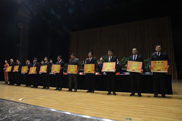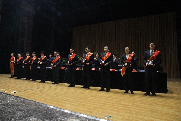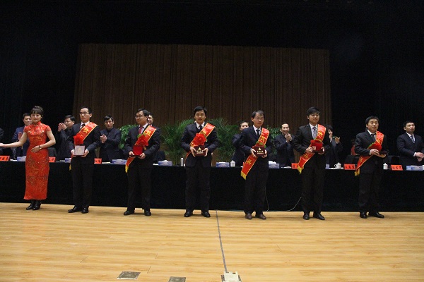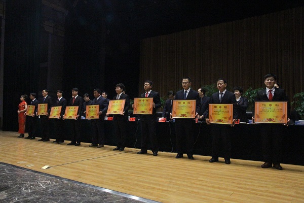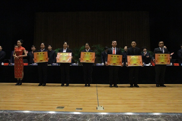 8:00,會議在雄壯的國歌聲中開幕。公司副總經(jīng)理張文勇宣讀了《關于表彰2016年度先進集體和先進個人的決定》,在歡快的樂曲和熱烈的掌聲中,秦慶平董事長首先為企業(yè)功勛楊建華頒發(fā)了金牌,隨后,10名勞動模范、6 名技術標兵、10名最佳進步獎獲得者、357名明星員工的代表、8個先進單位、28個先進班組依次上臺領獎,公司領導為他們頒獎。