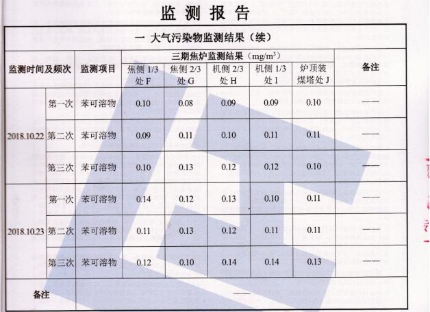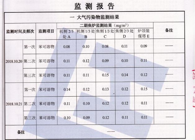 公司2018年10月20日-10月24日委托青島衡立檢測有限公司對(duì)公司廠界無組織與焦?fàn)t爐頂無組織進(jìn)行現(xiàn)場取樣檢測,檢測結(jié)果見下表: