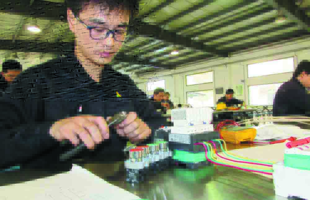 電工比武,選手一字排開,選料、繪圖,接線、送電,忙而不亂,場(chǎng)面頗為壯觀;