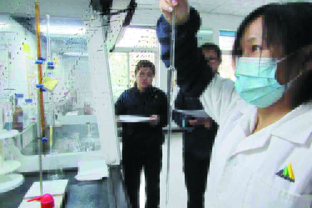 實(shí)驗(yàn)室內(nèi),比武人員身著白色工裝,天平稱量,試管滴定,數(shù)據(jù)計(jì)算,結(jié)果比對(duì),用心點(diǎn)評(píng),受益頗多;